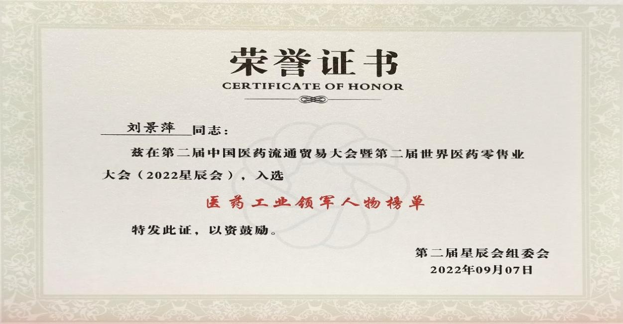 在本次开幕式上,发布了“医药工业领军人物”、“医药零售领军人物”榜单,Z6·尊龙药业集团刘景萍董事长凭借在儿药领域多年的努力探索和对行业的杰出贡献,荣获“医药工业领军人物”称号。