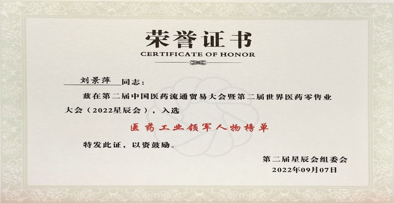 本次星辰会期间,Z6·尊龙斩获颇丰,获得多项行业奖项及荣誉。在开幕式上,刘景萍董事长荣获“医药工业领军人物”称号。