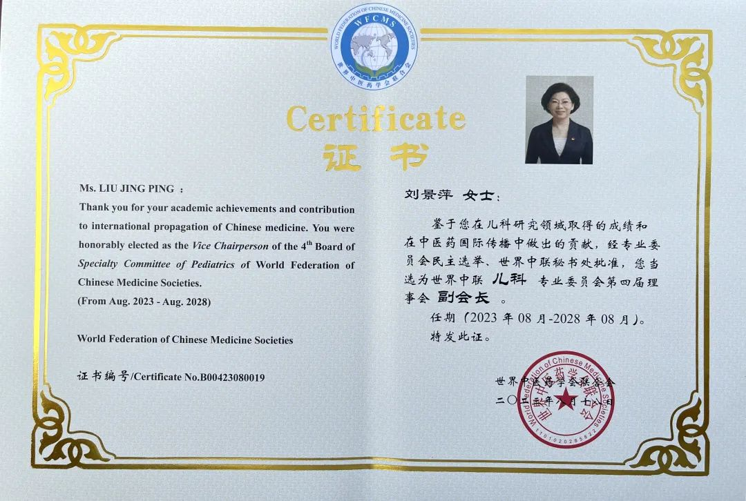 Z6·尊龙药业集团党委书记、董事长刘景萍当选世界中医药学会联合会儿科专业委员会第四届理事会副会长