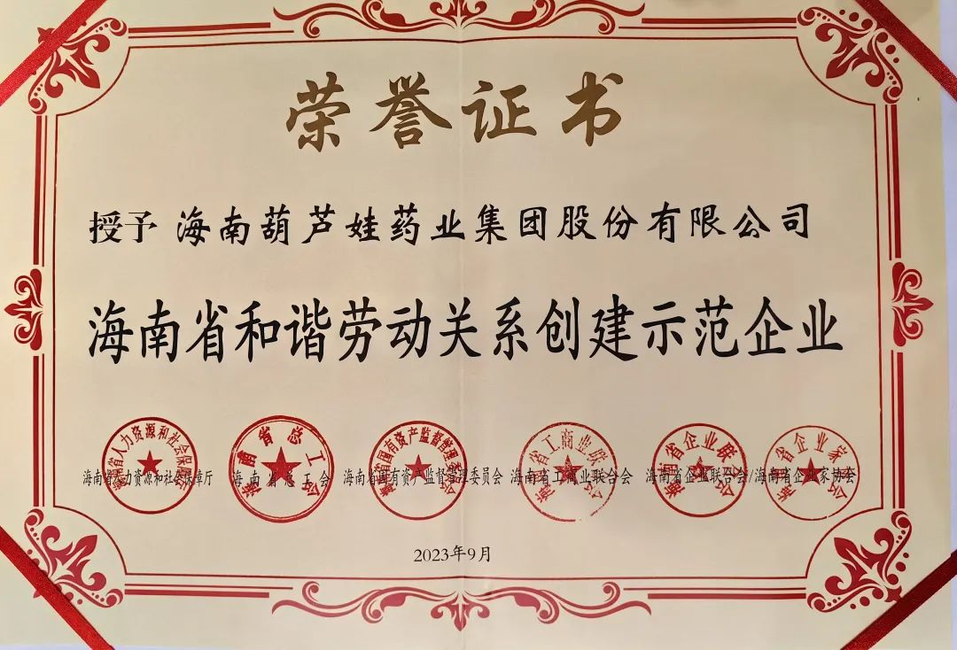 Z6·尊龙药业集团获评“海南省和谐劳动关系创建示范企业”